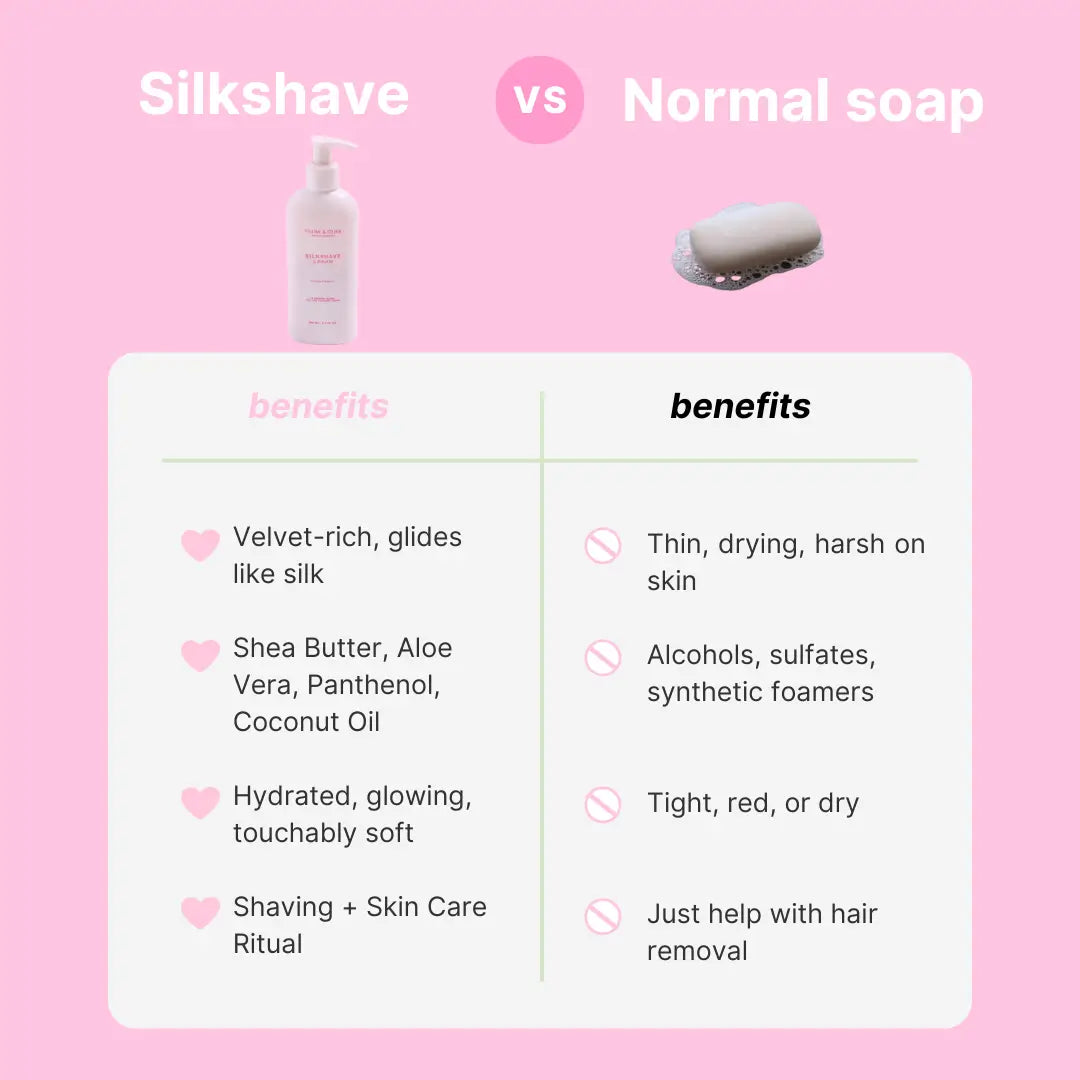 Traditional foams dry out your skin SilkShave doesnāt. It hydrates while you shave, creating a silky barrier that helps your razor glide effortlessly and leaves your skin visibly radiant.