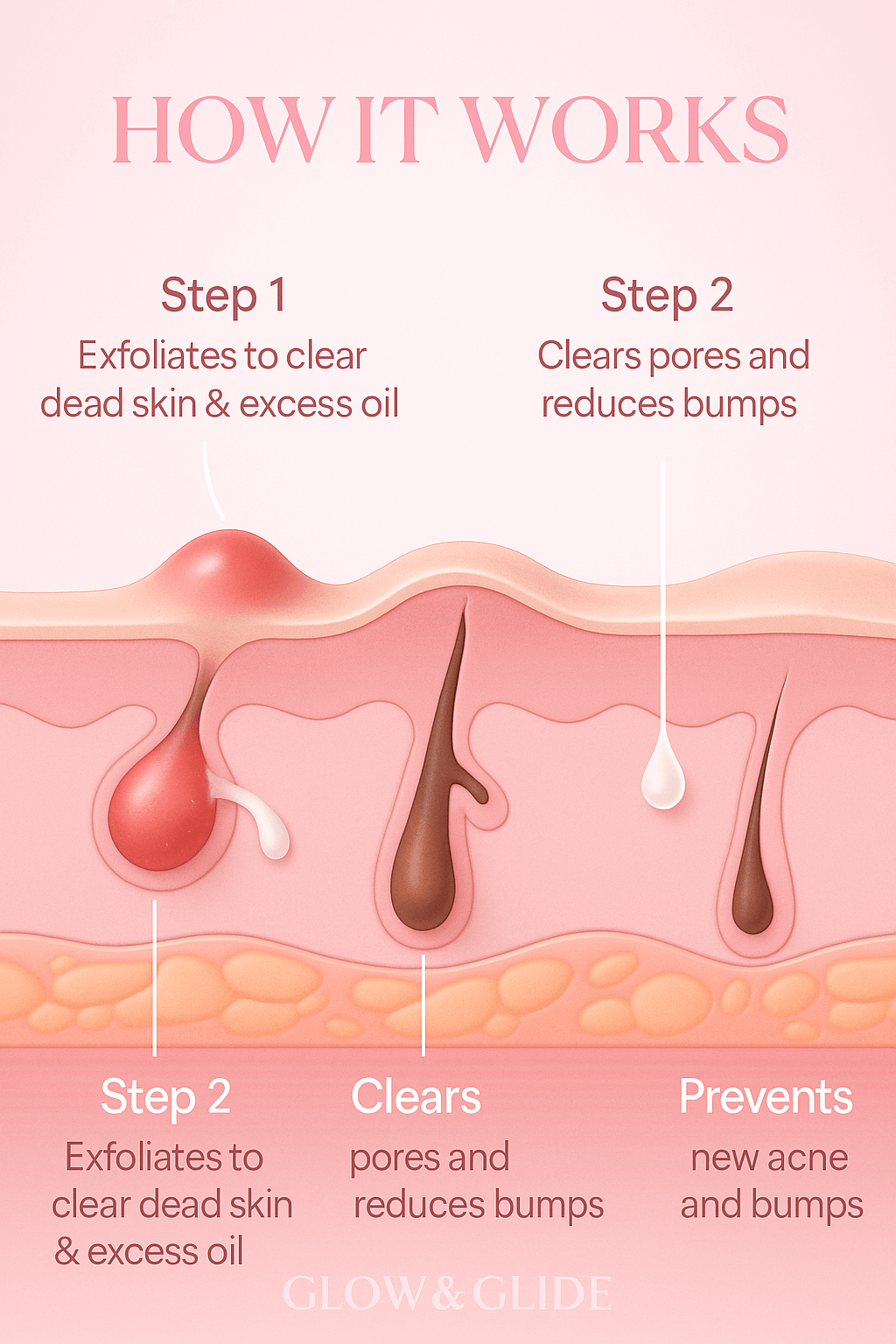 It uses Salicylic Acid (BHA) to clear clogged pores and Glycolic Acid (AHA) to exfoliate dead skin ā together, they free trapped hairs and smooth the surface.